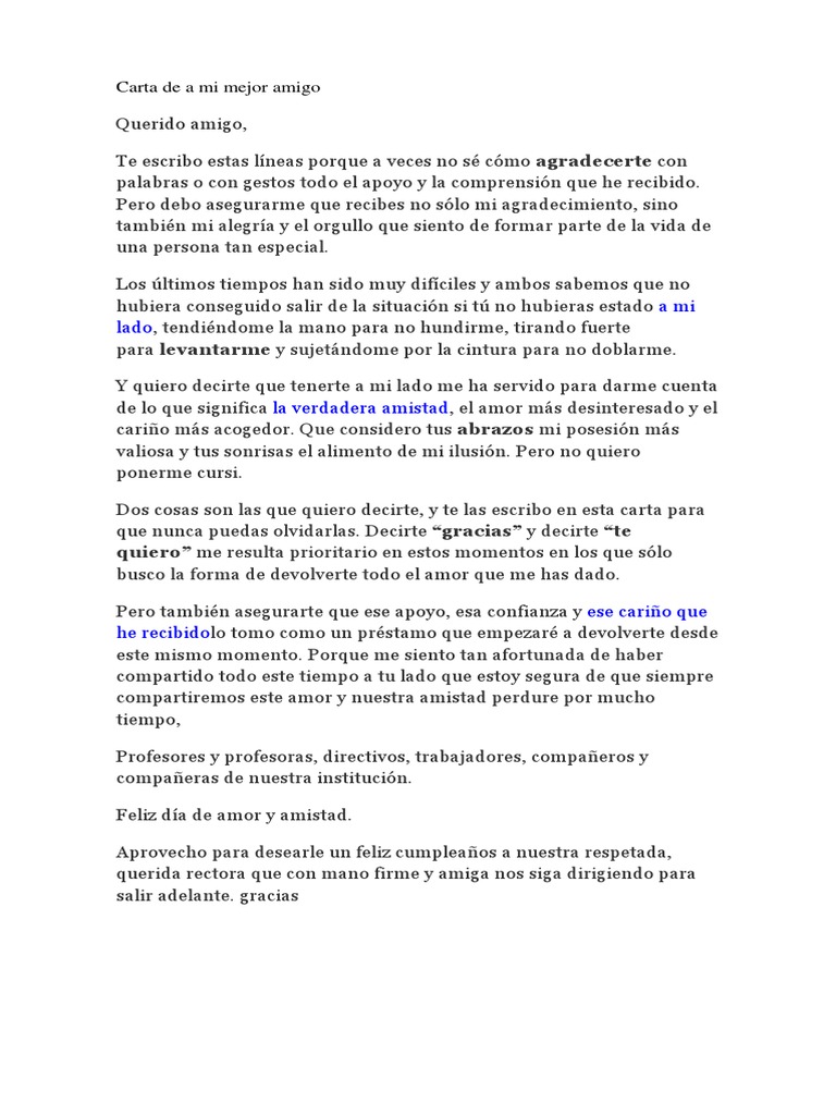 Carta Para Mi Mejor Amigo Amistad Amor Amigovios from www.cartasdeamor.tv Valeria ávila 17 ago 2015. Querido mejor amigo… tengo tantas cosas que expresarte que realmente no sé cómo empezar ni mucho menos expresarlas. Amigo, sé que te he fallado, sé que hemos discutido por una tontería que, de repente, se ha hecho más grande de lo que nosotros. Gracias por brindarme tu amistad, apoyo y confianza, tengas un hermoso mañana y un futuro prometedor en lo que hagas. Te quiero porque me enseñaste que no importa lo que creas de una persona antes de conocerla, al final puedes sorprenderte y encontrar a alguien muy especial para tu vida. Tu amistad es un regalo del cielo. Es bonito muchas veces decirle a tu amigo que lo. 4 gracias por haber sido tan buen amigo durante todos estos años.